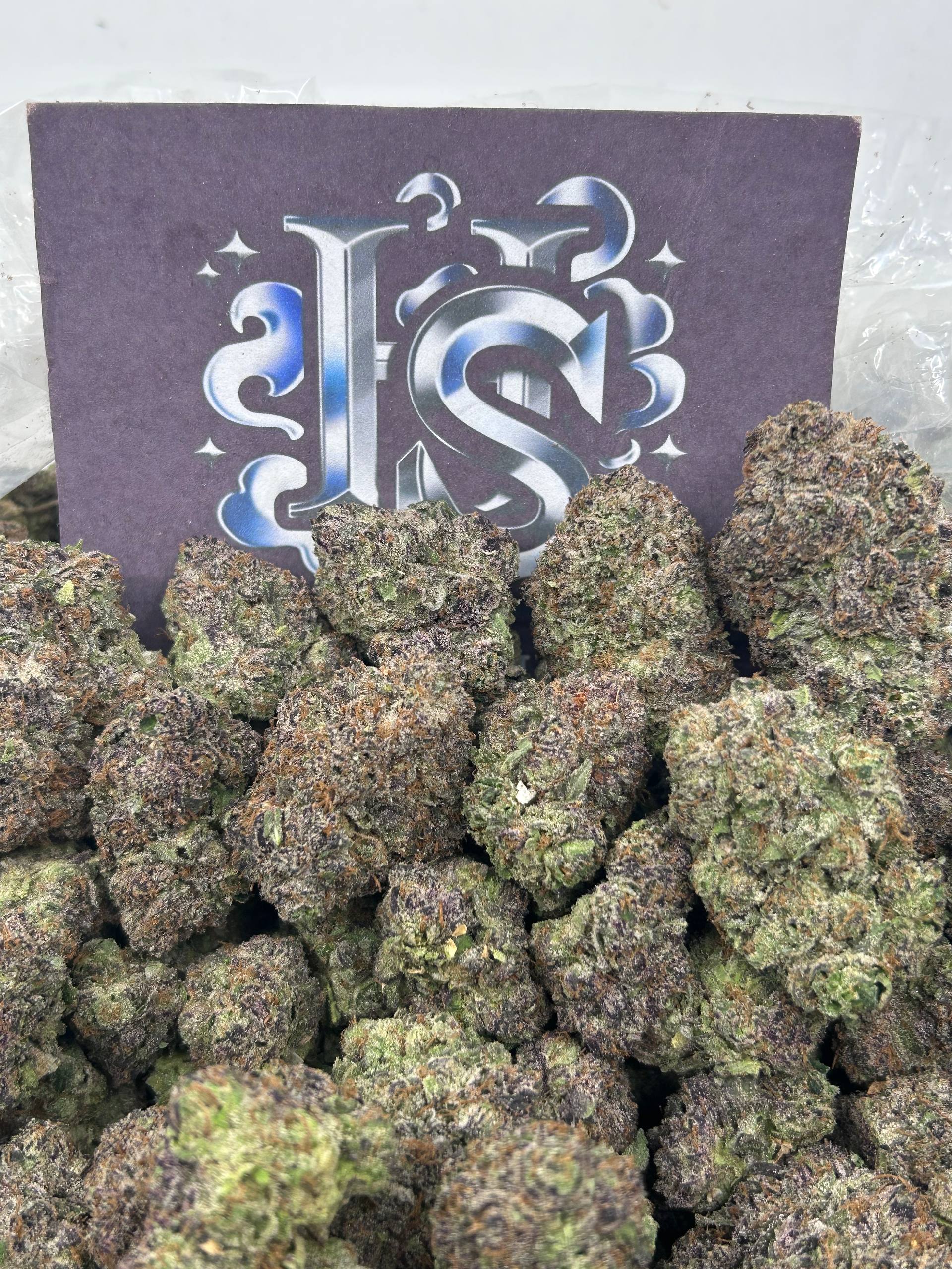 Bright lime green buds with purple mixed in and thick frost trichomes, bright orange pistils