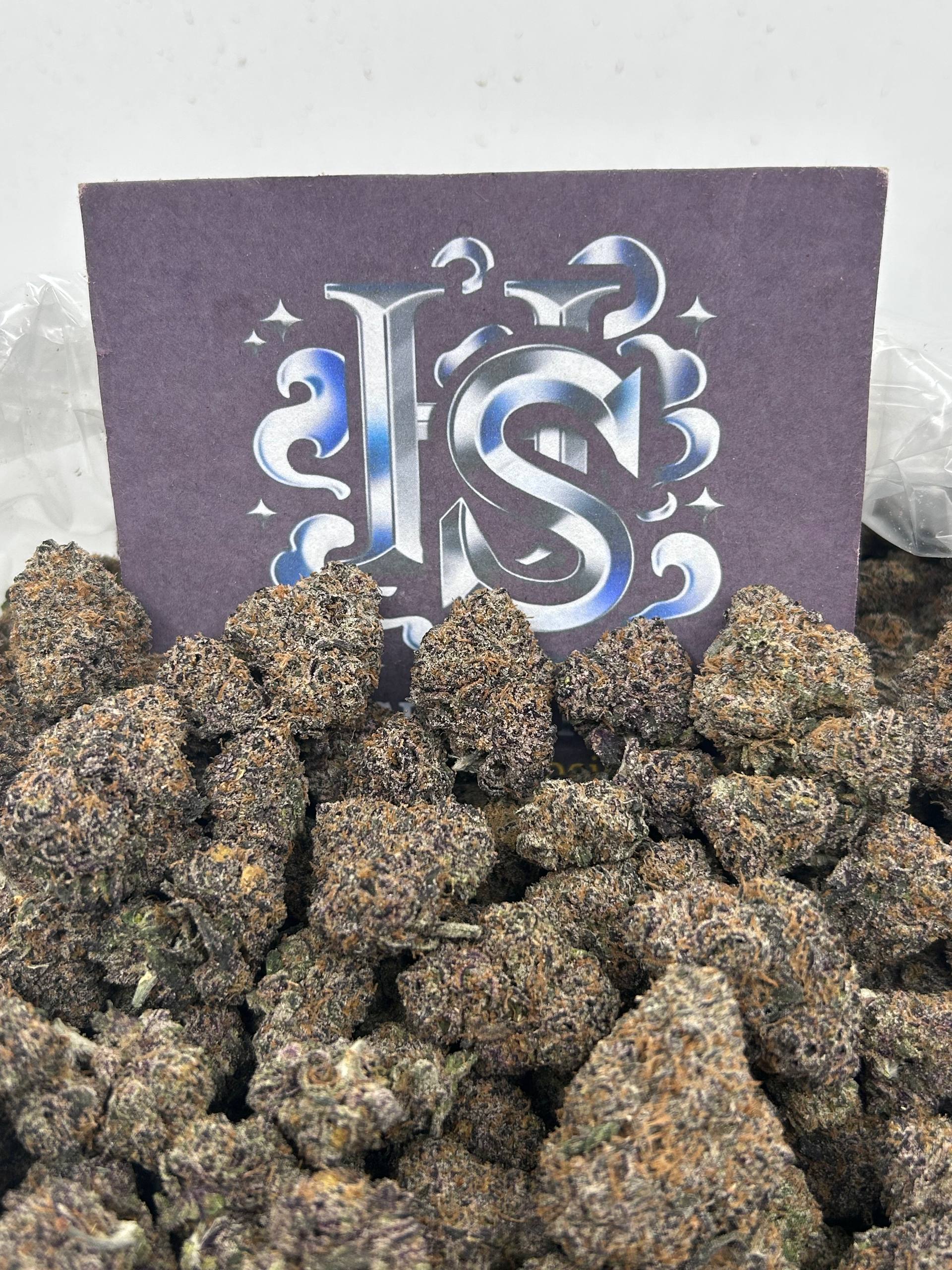 Extremely frosty purple nugs with orange pistils.